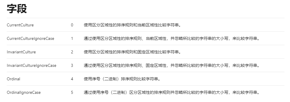 可以看到,默认使用了 StringComprison.CurrentCulture,关于其具体的定义,可以参照官方文档:
