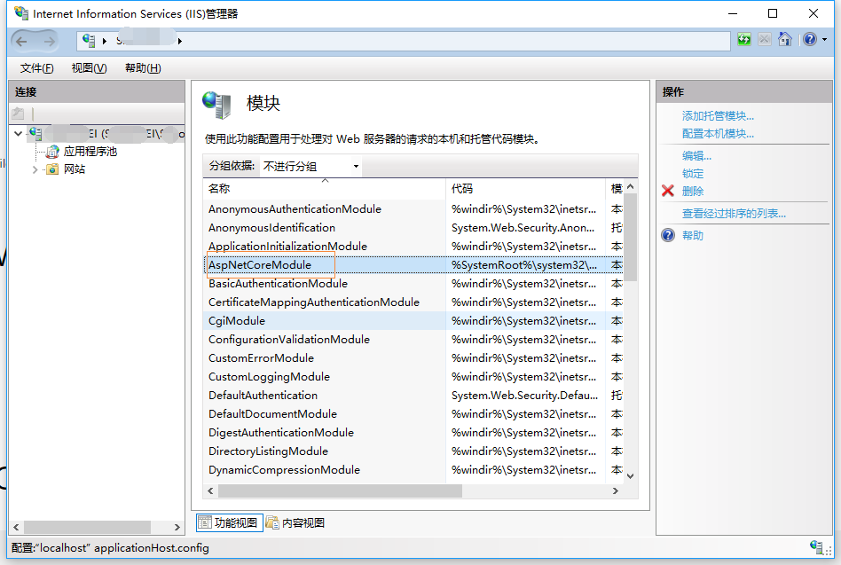 下载安装完成以后即可在IIS的模块中找到托管.NET Core 应用所需的 AspNetCoreModule 模块。