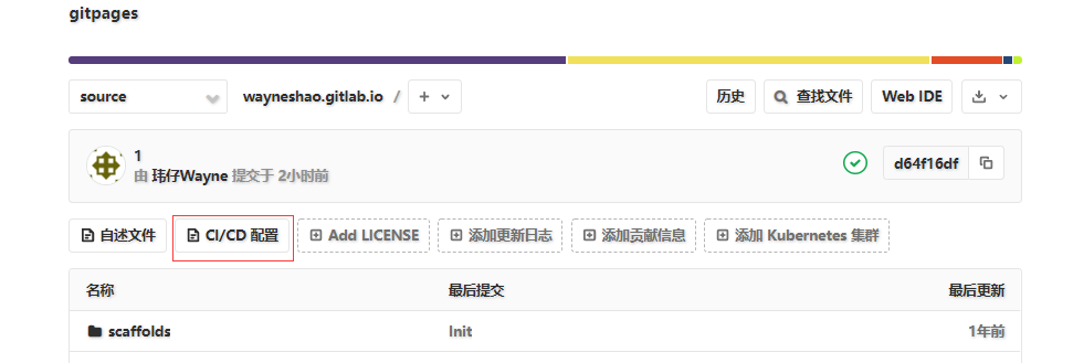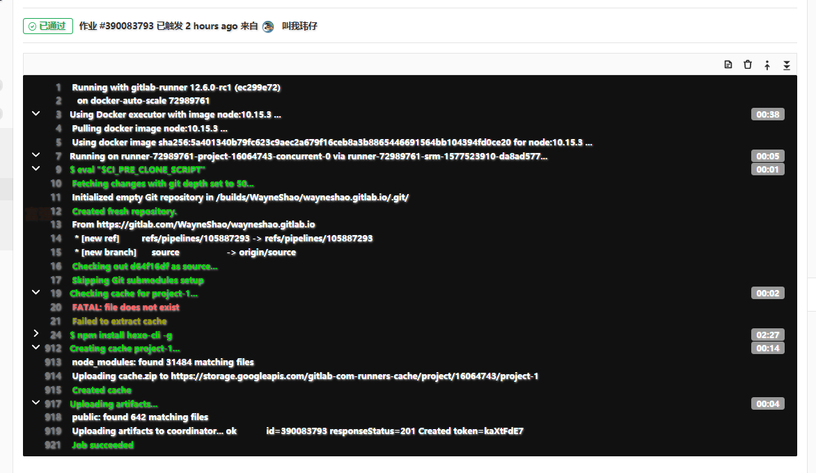 如果没有禁用共享 git-runner,那提交 .gitlab-ci.yml 之后就能看到如下的部署过程了,可能会比较慢,等待邮件通知即可。