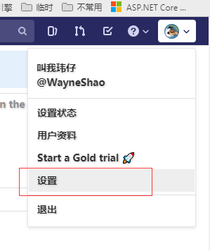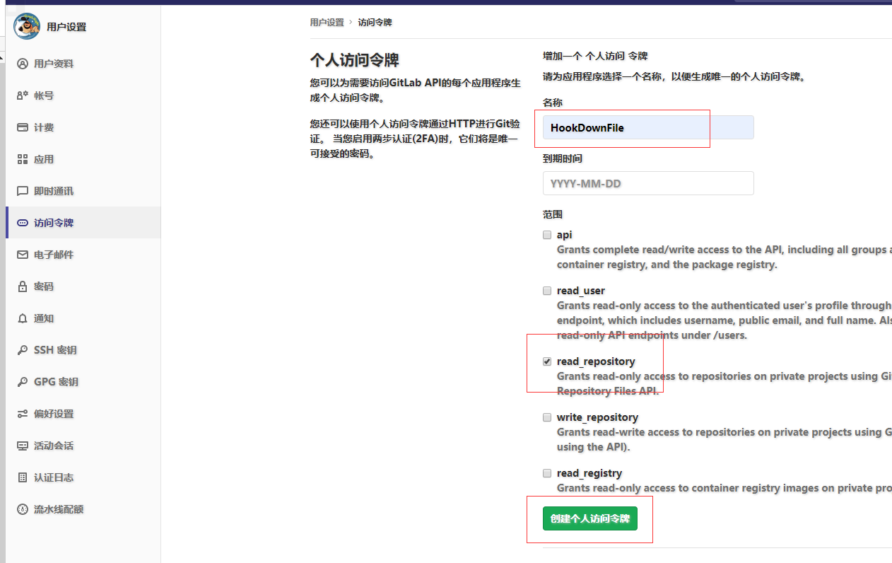 在下载文件时,需要使用访问令牌,转到个人设置菜单,新增一个访问令牌: