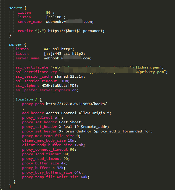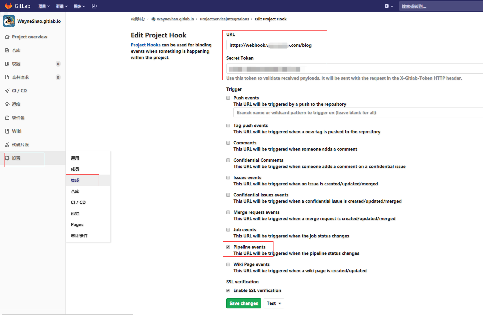 | [ { "id": "blog", "execute-command": "/var/scripts/update-blog.sh", "command-working-directory": "/opt/backup-blog", "pass-arguments-to-command": [ { "source": "payload", "name": "builds.0.artifacts_file.size" } ], "response-message": "job done!", "trigger-rule": { "and": [ { "match": { "type": "value", "value": "(仓库中配置的 Secret Token)", "parameter": { "source": "header", "name": "X-Gitlab-Token" } } }, { "match": { "type": "value", "value": "pipeline", "parameter": { "source": "payload", "name": "object_kind" } } }, { "match": { "type": "value", "value": "success", "parameter": { "source": "payload", "name": "object_attributes.status" } } } ] } } ]