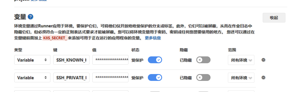 参照官方文档,命名为 SSH_PRIVATE_KEY 和 SSH_KNOWN_HOSTS。