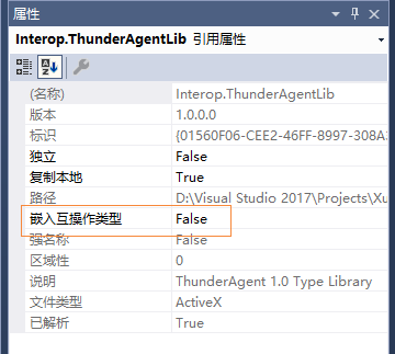 安装迅雷后可以再引用的com组件中找到名为 “ThunderAgent 1.0 Type Library” 的com组件,勾选引用之后,把类库属性中的嵌入互操作类型修改为false。