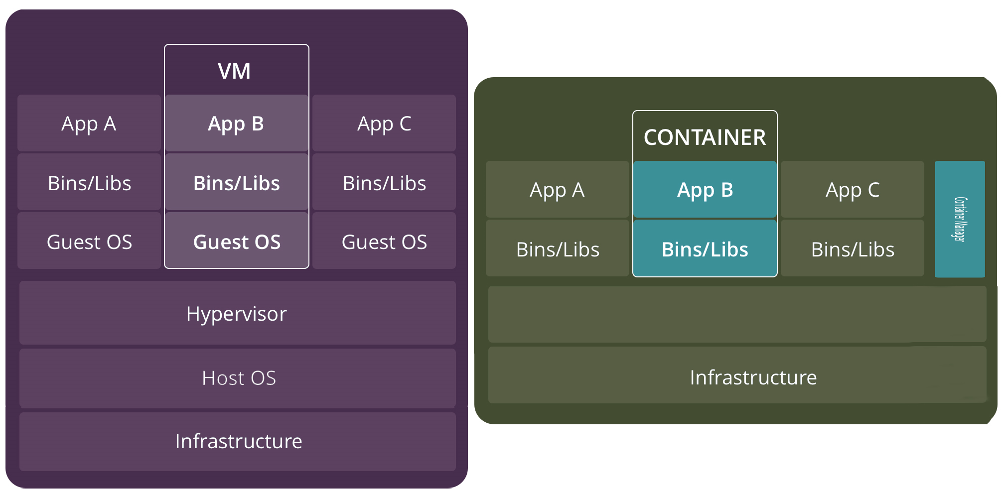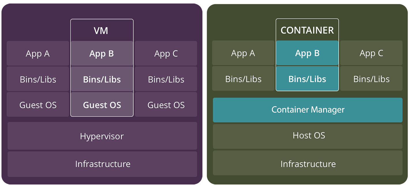 上图是网上常见的虚拟机和容器的对比通,把容器管理系统放到了跟虚拟系统一个级别,实际是有问题的,我们对它做一下纠正。