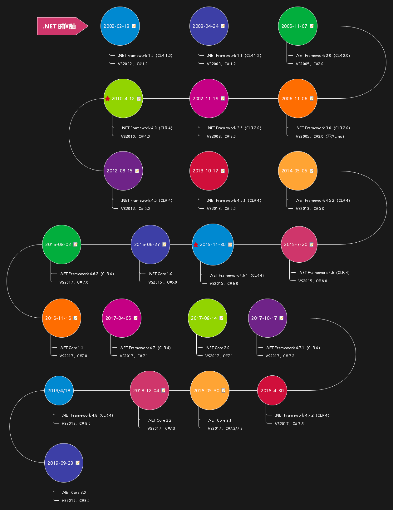 下图是总结了 C# 语言从发布到现在的各个版本和相应的发布时间、框架版本、VS版本
